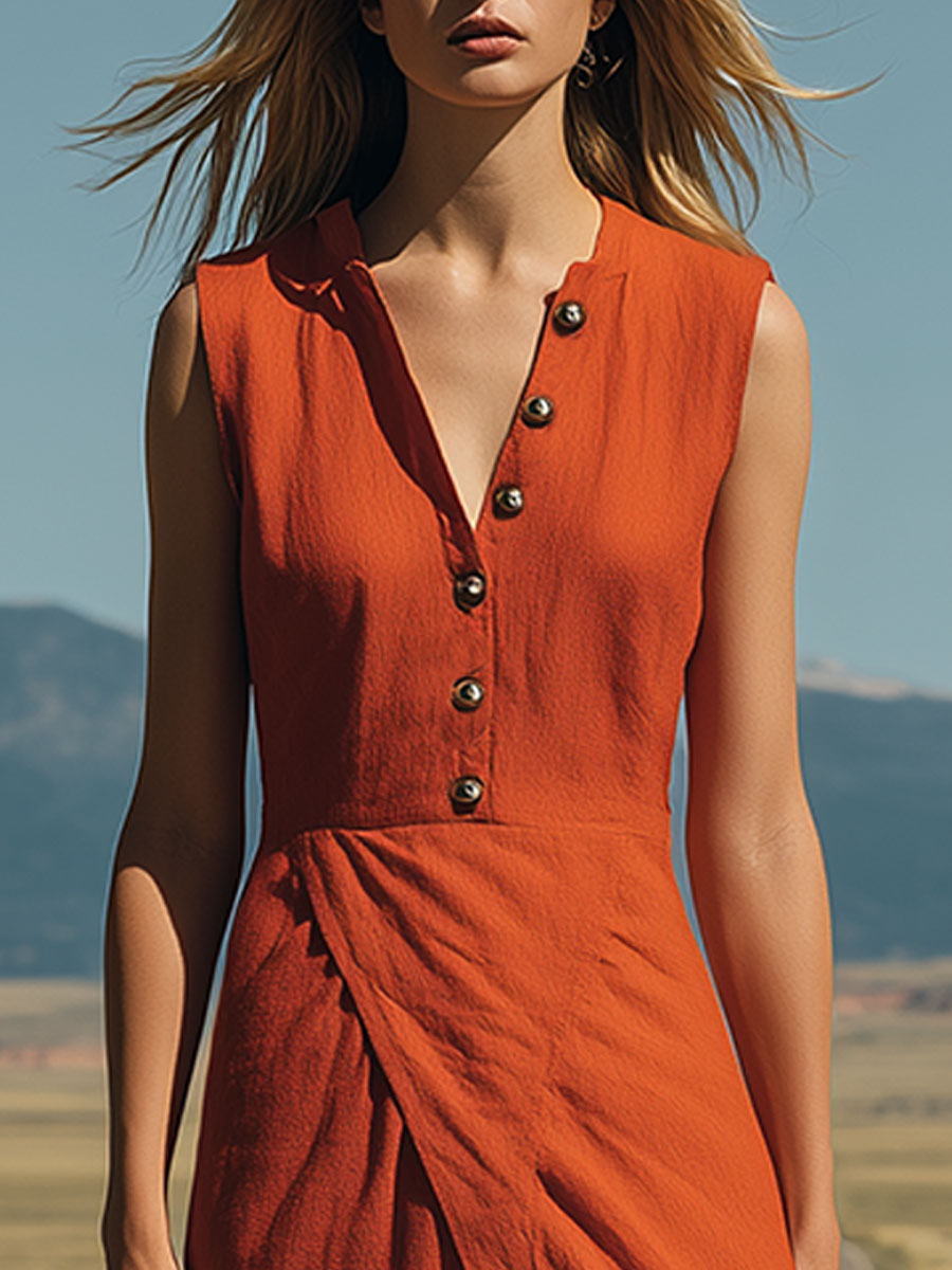 Western Retro Casual Orange Sleeveless Cotton Linen Midi Dress