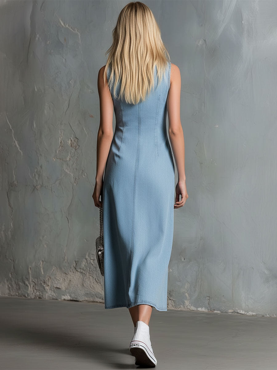 Stylish Retro Blue V-Neck Button-Front Sleeveless Denim Midi Dress