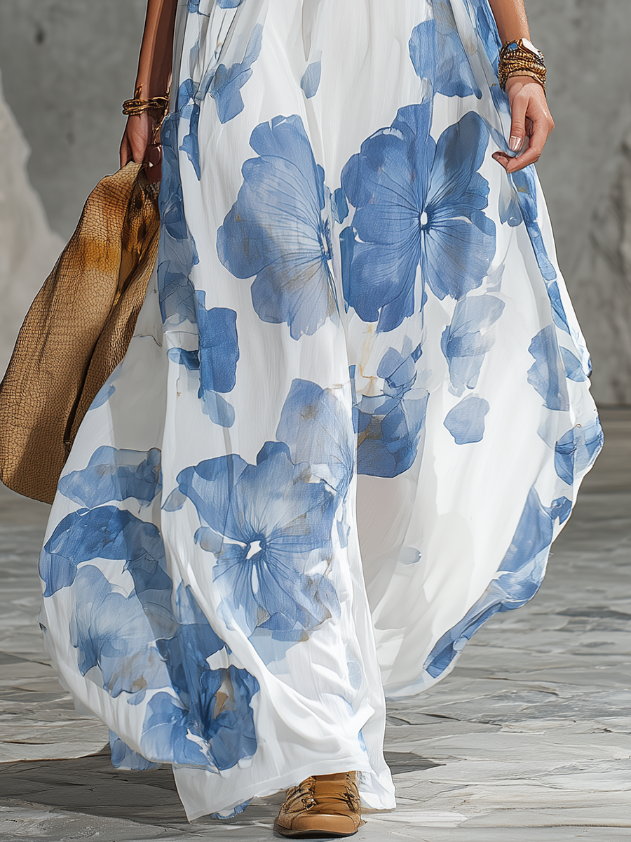 A sweeping, retro-inspired chiffon maxi that channels sun-soaked getaway glamour: oversized florals bloom across lightweight, semi-sheer chiffon that drapes from a relaxed bodice into a generous, floor-grazing skirt. Design details—soft gathers at the neckline, subtly shaped shoulders, and a gentle A-line cut—create fluid movement and an elegant silhouette that never feels fussy. Partially lined for easy wear, the dress balances airy breathability with polished coverage for a romantic, vintage-forward statement.