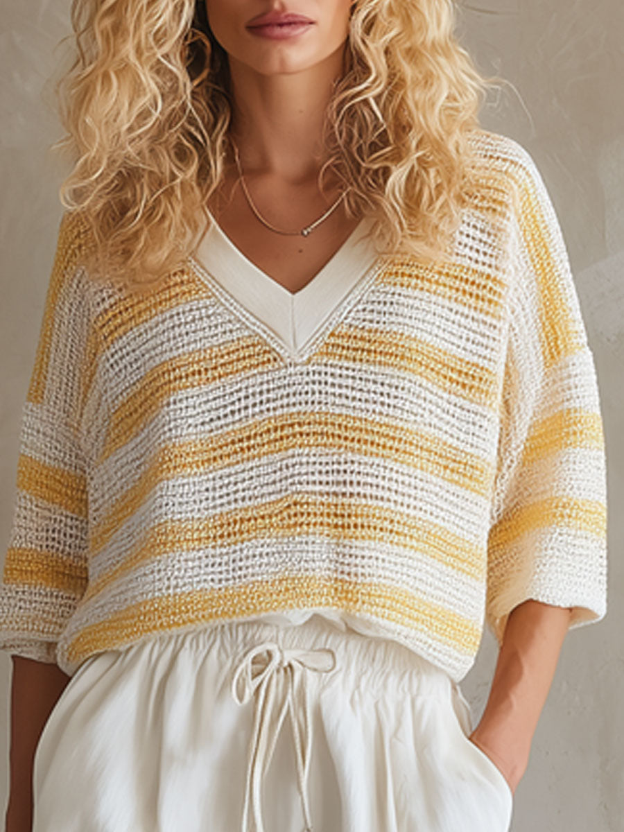 • Casual Retro Mid-sleeve Striped Knit Top And White Cotton Shorts Set