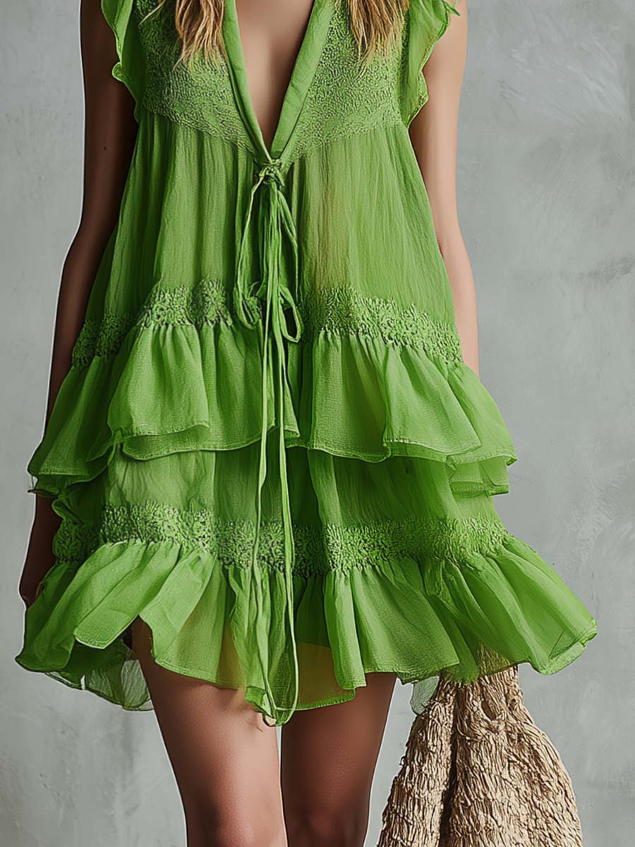 Retro Bohemian Tie-neck V-neck Lace-trimmed Bright Green Chiffon Mini Dress