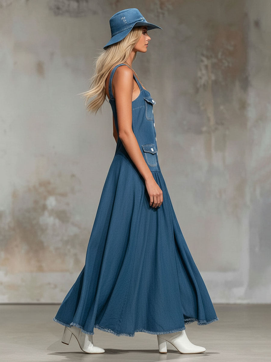 • Retro Multi-pocket Square Neck Denim Sleeveless Maxi Dress