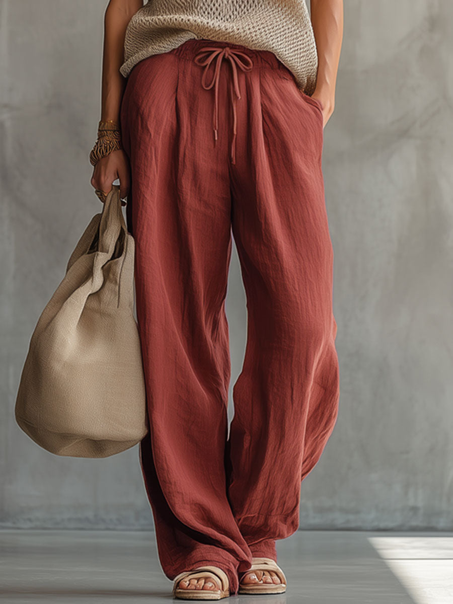 • Retro Short-sleeved Knit Top And Brick Red Cotton Linen Wide-leg Pants Set