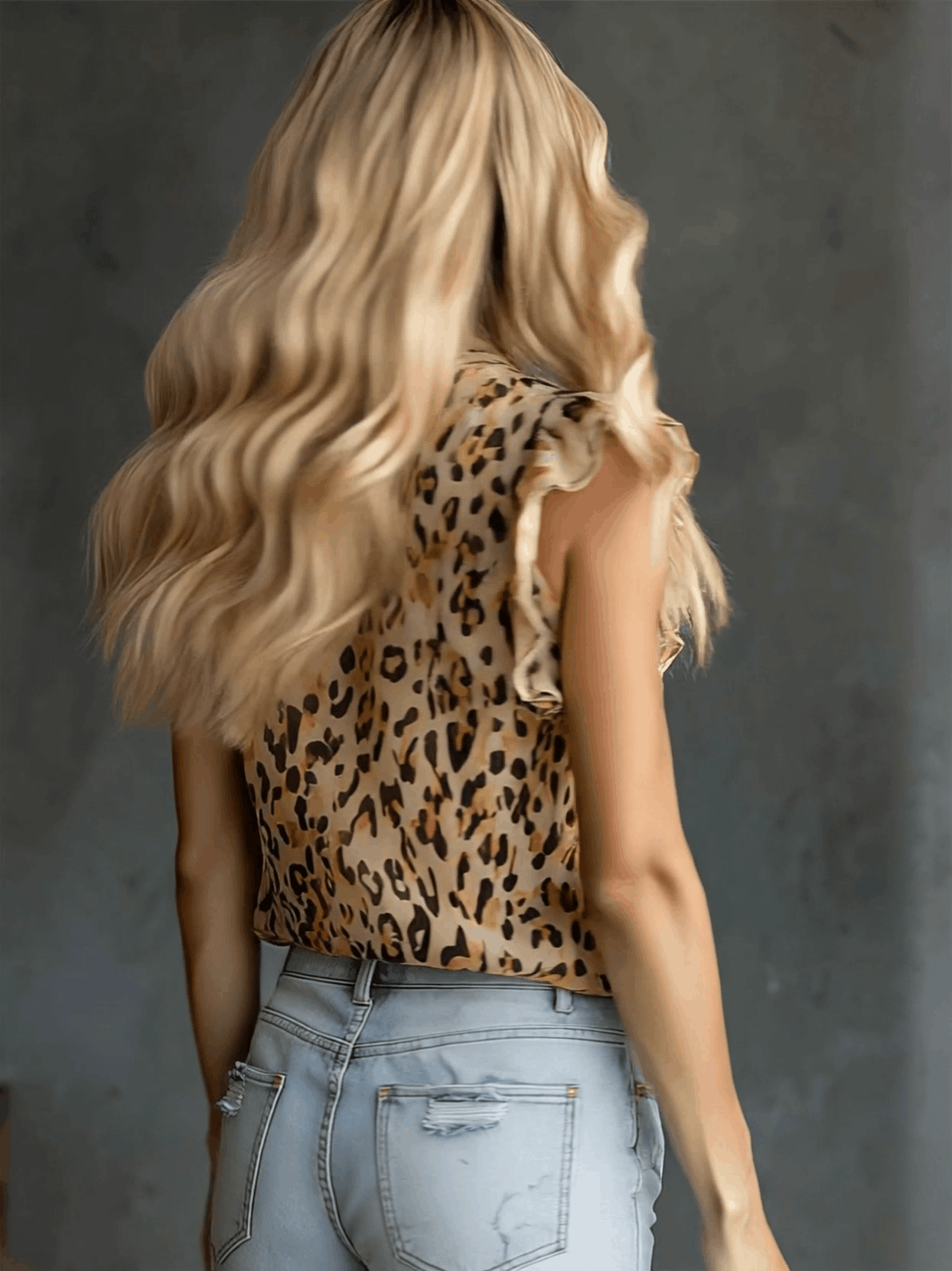 The fashionable retro leopard print sleeveless V-neck ruffled chiffon shirt is an embodiment of vintage allure coupled with contemporary style. Its eye-catching leopard print exudes a sense of boldness and adventure, drawing inspiration from classic motifs that never seem to go out of style. The sleeveless cut enhances its versatility, making it ideal for layering or wearing alone in warmer climates. The V-neckline contributes to its chic appeal, offering a flattering silhouette that complements various body types and highlights the neckline elegantly.