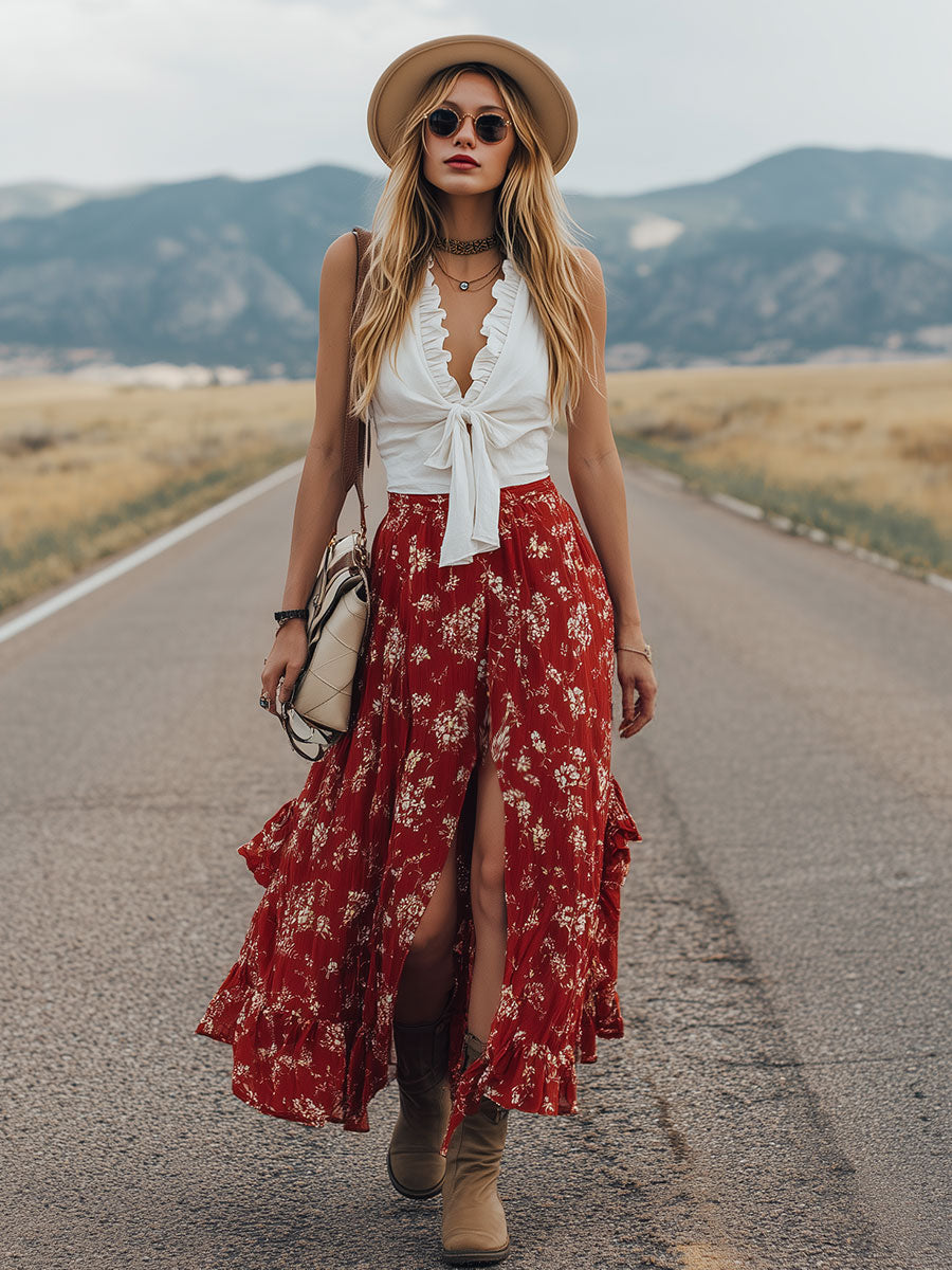 Western-style Retro White Ruffled Sleeveless Cotton-linen Blouse And Retro-print Red Chiffon Skirt Set