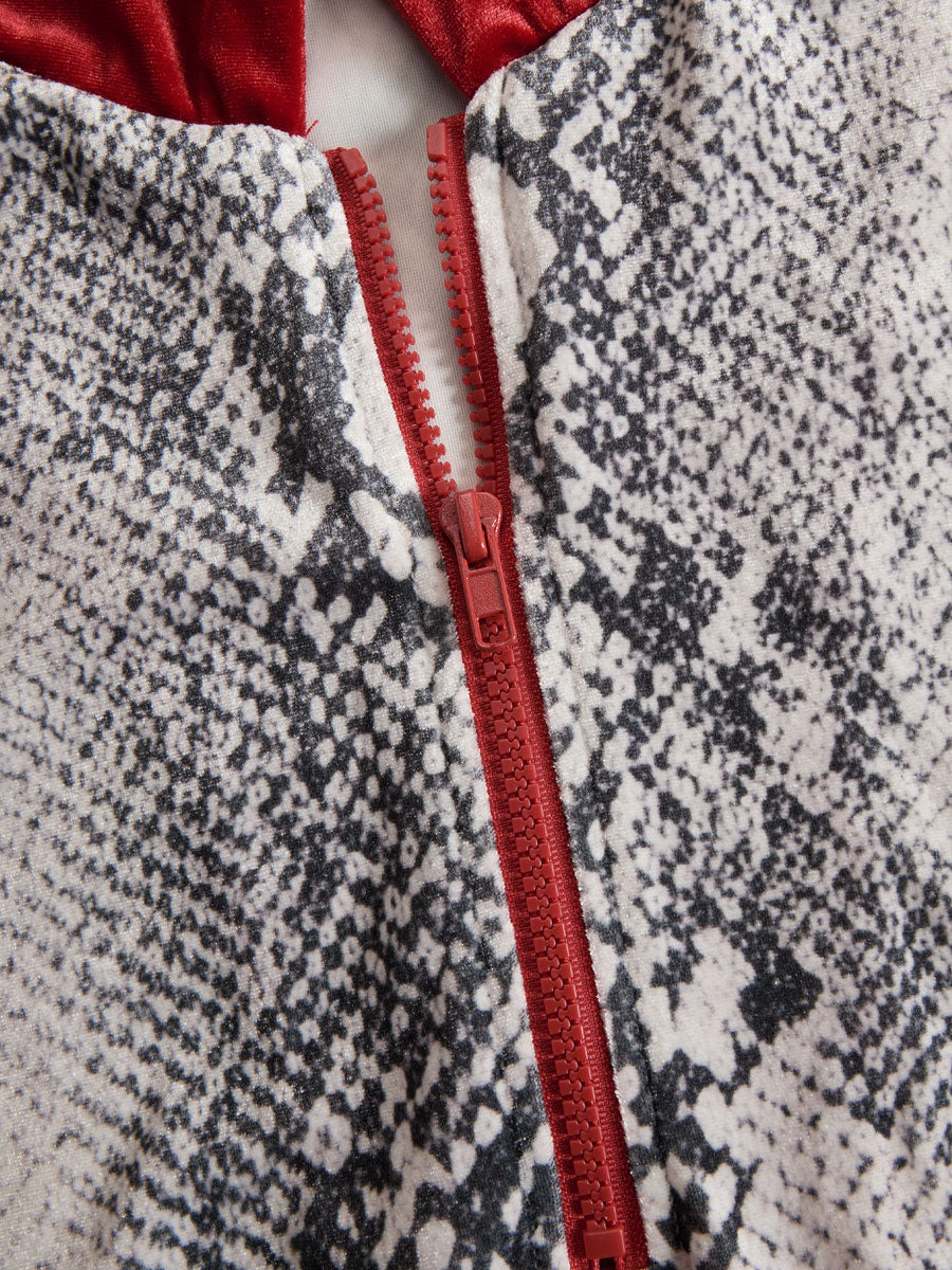 2.Design: Contrasting hooded collar, zipper, long sleeves, snakeskin pattern, pockets.