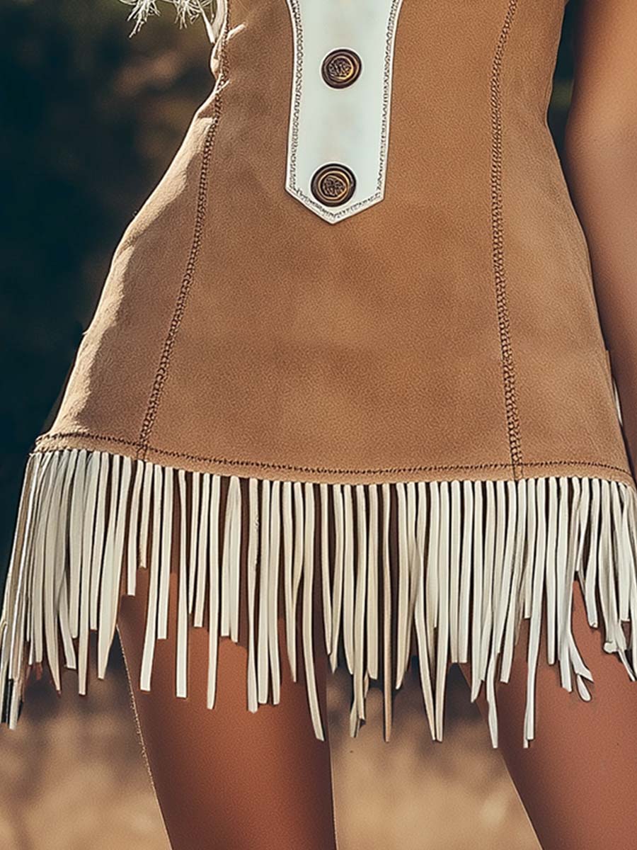 This dress captures the essence of retro western fashion with its unique design elements. The bold contrast pattern is perfect for making a statement and turning heads. The fringe adds a dynamic and eye-catching detail to liven up your outfit. The lapel adds a touch of elegance and elevates the overall look. It is designed for those who pursue fashion without losing the nostalgic touch. Whether it is a day out or a night out on the town, this dress can show unparalleled fashion taste and charm.