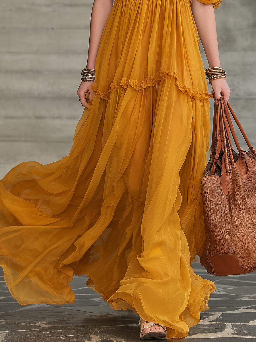 An elegant, retro-inspired chiffon maxi that reads like a romantic resort staple: delicate spaghetti straps frame a soft, feminine neckline while lightweight chiffon cascades from a gently gathered bodice into a sweeping, floor-skimming skirt. The airy, semi-sheer fabric creates beautiful movement and a dreamy silhouette that’s both refined and effortless; the dress is partially lined for comfortable coverage while maintaining an ethereal feel.