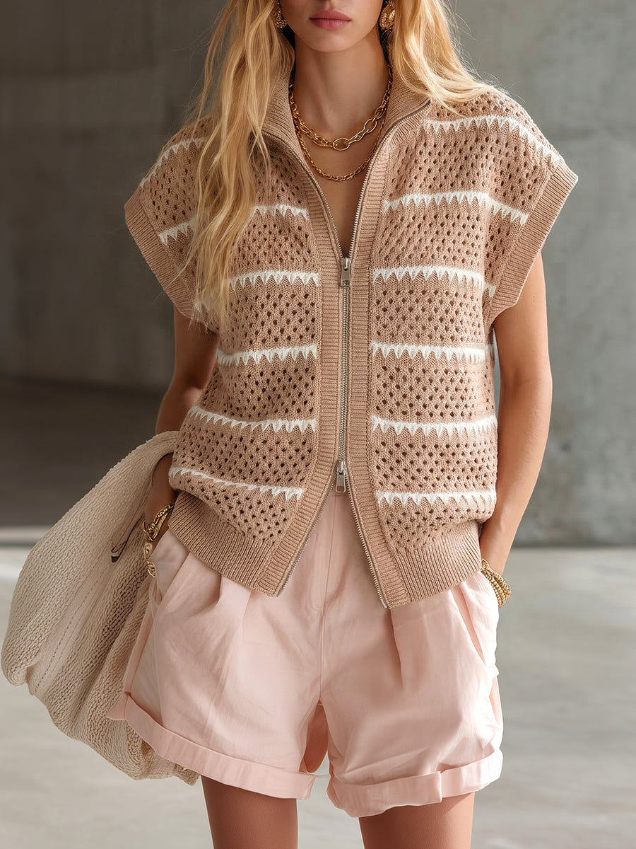 Casual Retro Apricot Cotton Linen Sleeveless Striped Shirt And Shorts Set
