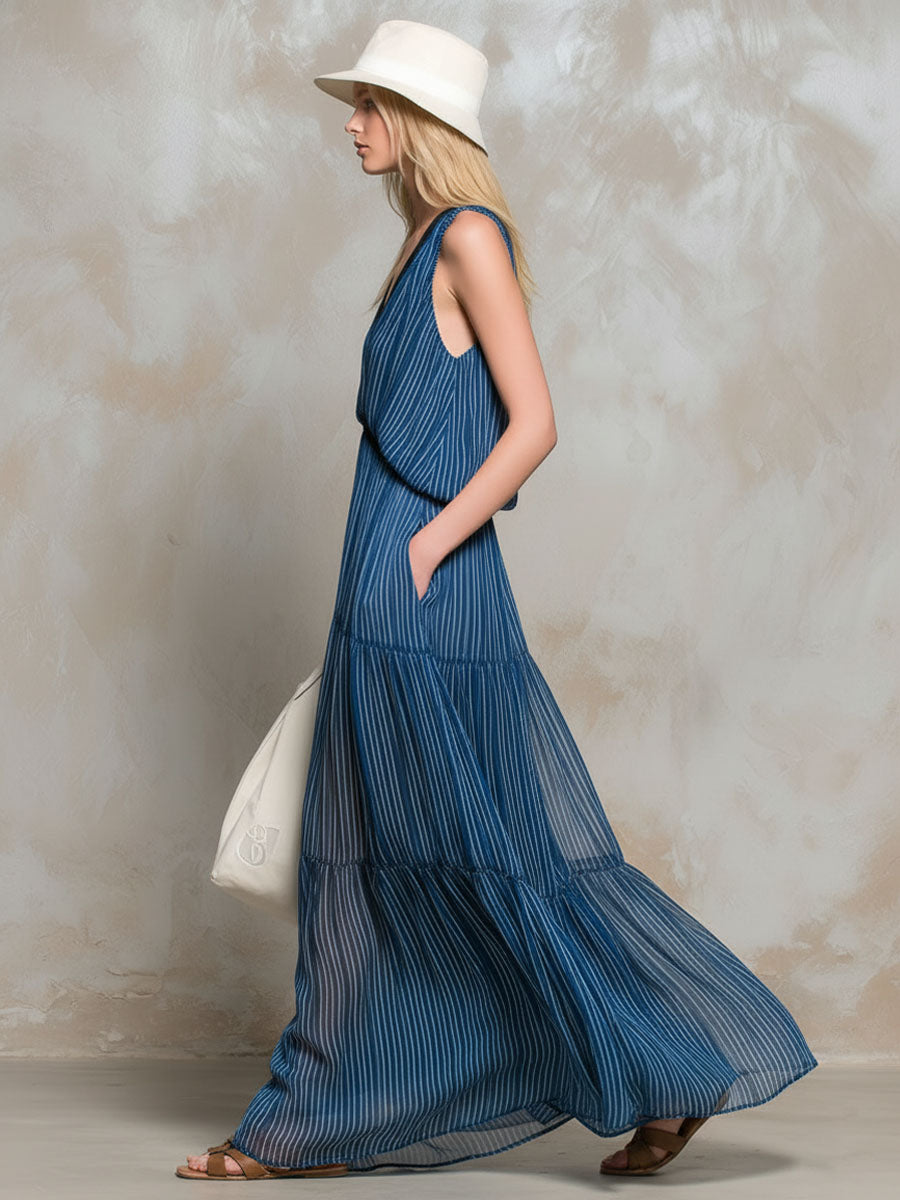 Vacation Light Blue Chiffon Sleeveless Top And Striped Wide-leg Pants Set
