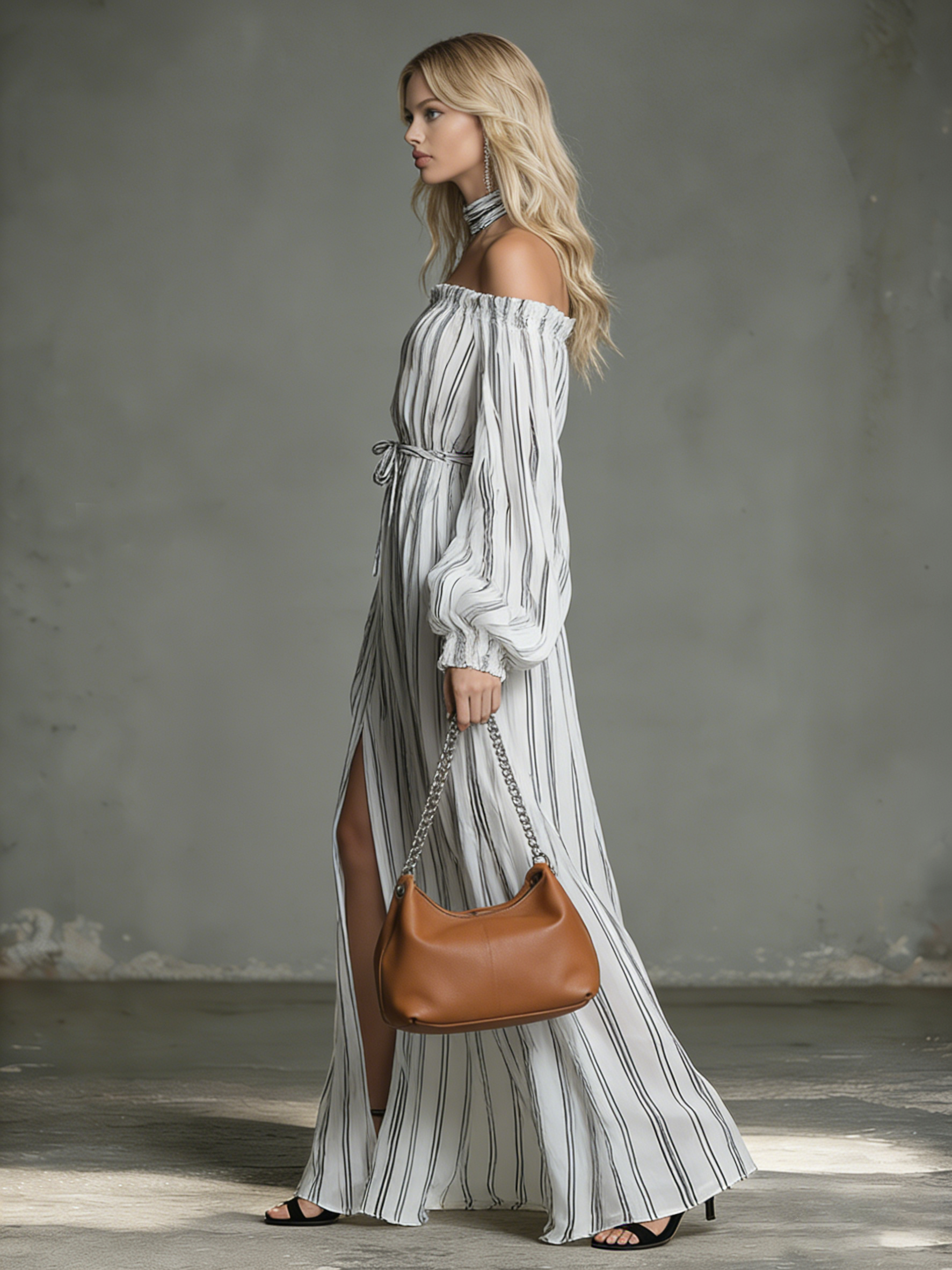 Retro Casual Vacation Black And White Striped Chiffon Off-shoulder Top And Pants Set