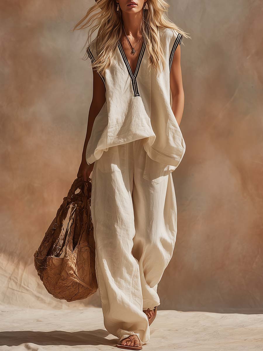 Retro-style Comfortable Bohemian V-neck Off-white Cotton And Linen Top And Pants Set
