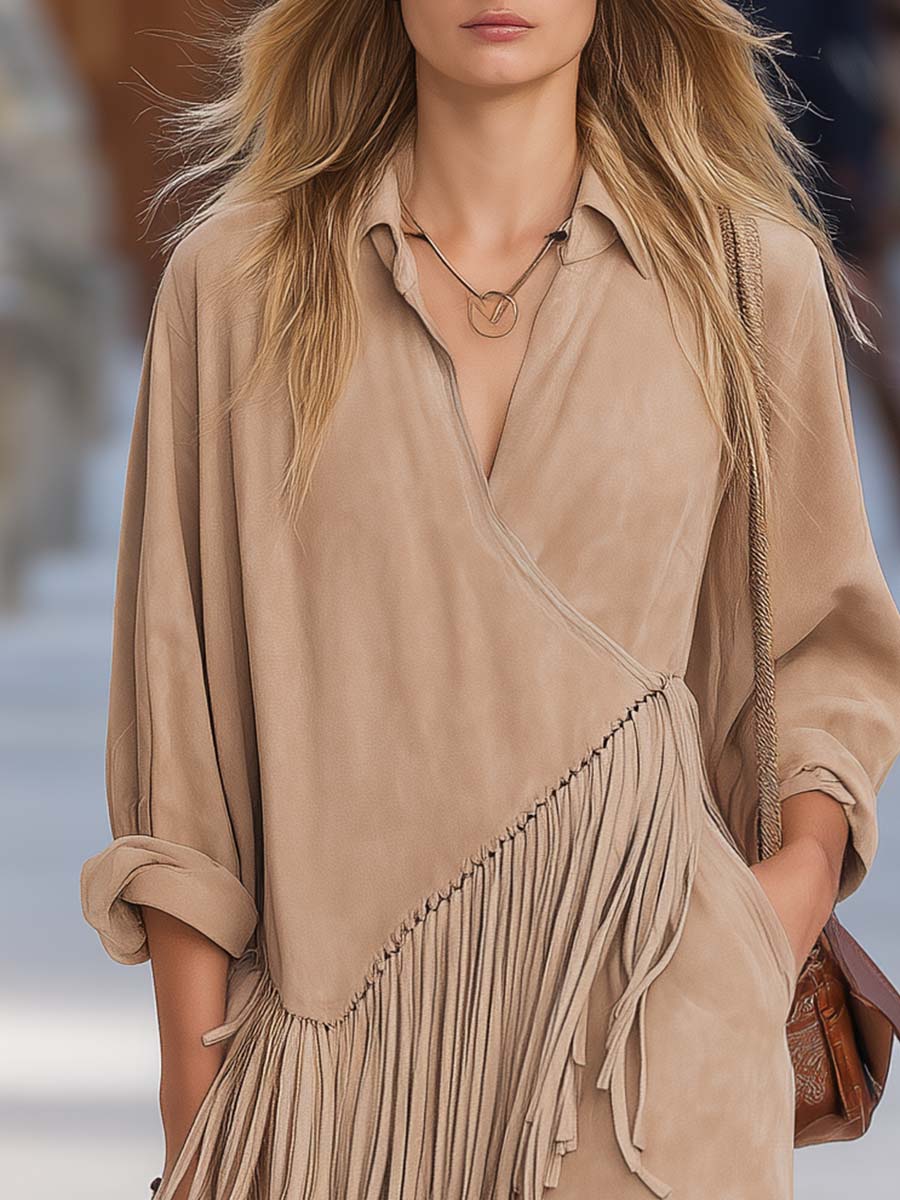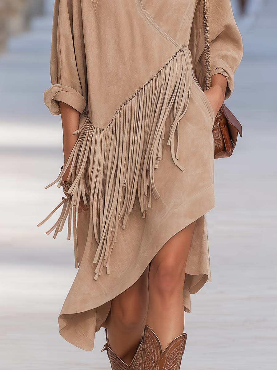 This beige faux suede midi dress combines old‑money refinement with a modern western edge. Crafted from a soft, suede‑like fabric in a neutral beige tone, it features a flattering V‑neck and delicate fringe trim that traces the yoke and sleeve lines, giving the piece subtle movement and artisanal character. The midi length and gently flared skirt create a timeless silhouette that reads polished yet relaxed.