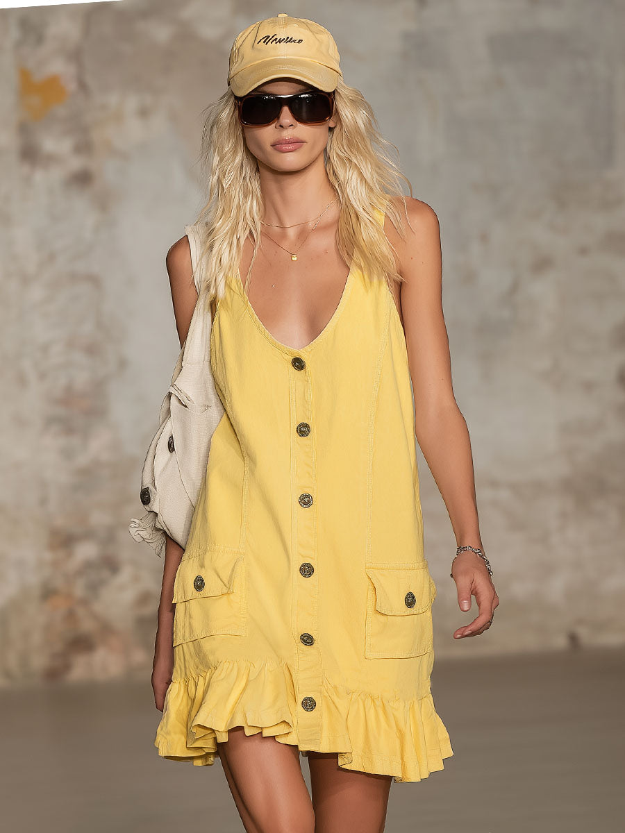Infuse vintage charm into your wardrobe with our Retro V‑Neck Button‑Down Cotton Ruffle Sleeveless Mini Dress. Made from soft, breathable cotton, this dress offers a light and comfortable feel ideal for warm days. The flattering V‑neckline and button‑down front give it a classic, easygoing look, while layered ruffle detailing brings playful movement and a touch of femininity. The sleeveless silhouette and mini length keep the shape breezy and youthful.