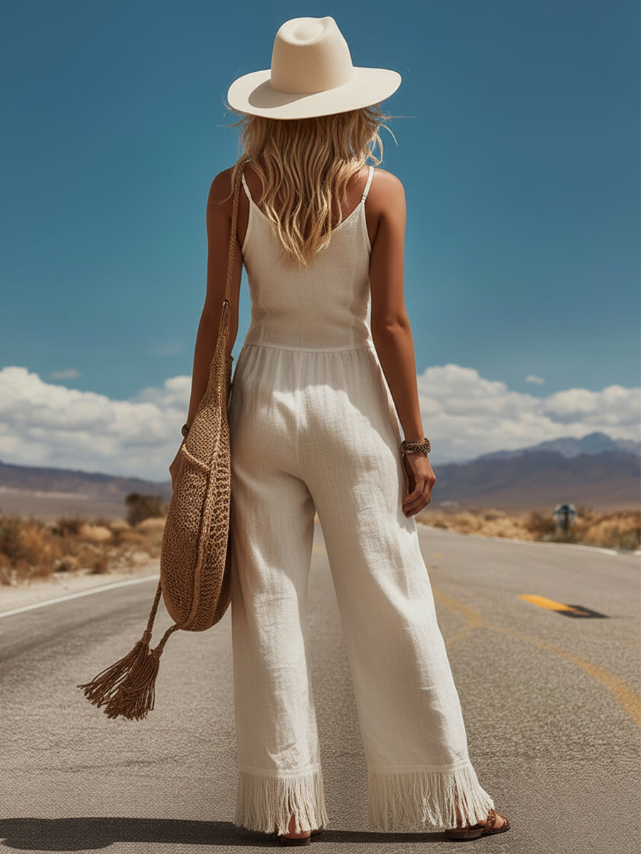 This sleeveless jumpsuit masterfully blends the breathable comfort of a cotton-linen fabric with refined Western-style details, creating a look that is effortlessly relaxed yet distinctly feminine. The soft ecru hue, accented by delicate lace trim, evokes a gentle vintage charm, while playful tassel ties add a touch of lively, whimsical movement. Designed for all-day comfort, this versatile piece transitions seamlessly from casual daytime outings to relaxed evening gatherings.